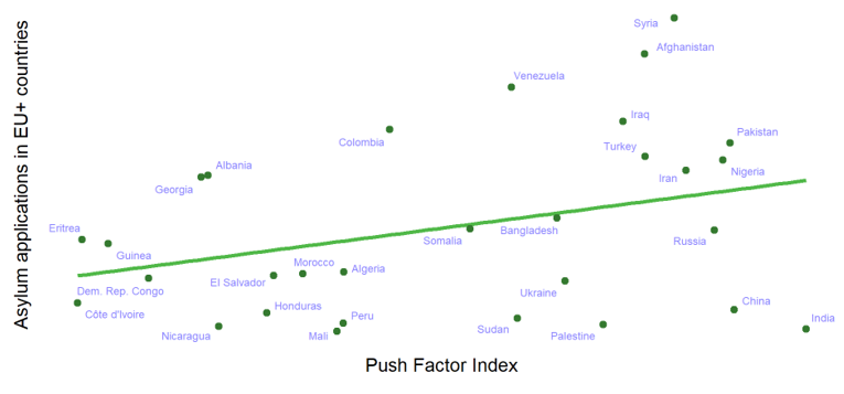 Sources: Administrative data from Eurostat for applications for international protection. EASO for the Push Factor Index.