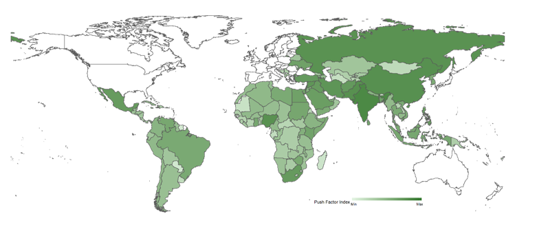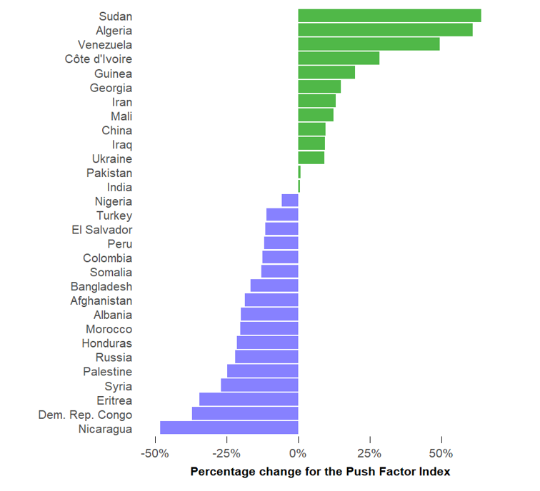 Events such as conflict, economic hardship, deteriorating governance, political tensions and social exclusion of marginalised groups have the potential to internally displace entire communities or force them to leave their homes to seek refuge in other countries. EASO uses big data on global media reports168  to quantify the frequency of such events, which are selected and weighted according to the magnitude of the effect they are likely to have on asylum-related migration. In the interests of simplification and to enable further analyses, these data have been aggregated into a composite indicator for each country of the world, referred to as the Push Factor Index (PFI).