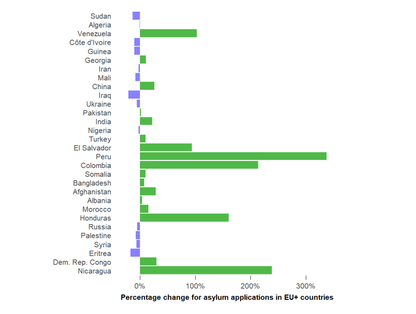 Figure 4.6 presents the Top 30 countries of origin for applicants, indicating where push factors increased or decreased. In many cases, changes in the PFI were closely related to similar changes in the number of applications lodged (see Figure 4.7). For instance, push factors increased in Venezuela by 50 % and in Georgia by 15 %, while citizens from these countries also lodged more applications for asylum in EU+ countries: Venezuelans with 103 % more applications in 2019 and Georgians with 11 % more. Similarly, the PFI fell in Nigeria by 6 % and Eritrea by 34 %, while citizens from these countries lodged fewer applications overall in Europe: applications by Nigerians fell by 2 % in 2019 and by Eritreans by 17 %. Likewise, Syrian nationals lodged 6 % fewer applications for asylum following a decrease in push factors of 27 %.