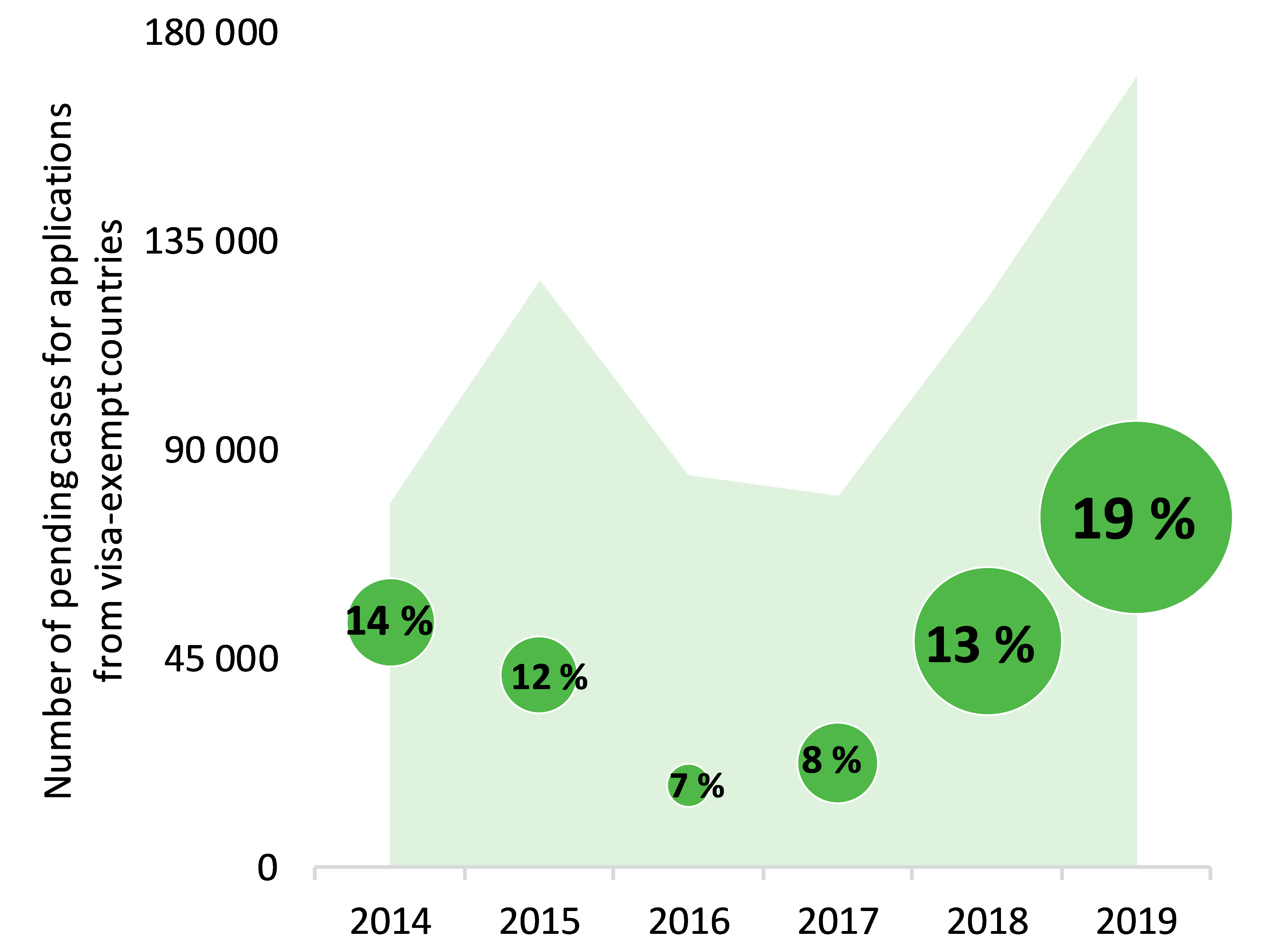 Note: The solid area represents all pending cases at first and second instance. The bubbles represent the share of pending cases for applications from visa-exempt countries.