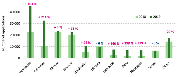 In 2019, there was a significant surge of applications from the Latin American region. Three-fifths of all applications from visa-liberalised countries (approximately 113 500) were lodged by citizens of Latin American countries, the majority from Venezuela, Colombia, El Salvador, Honduras, Peru and Nicaragua (in decreasing order).