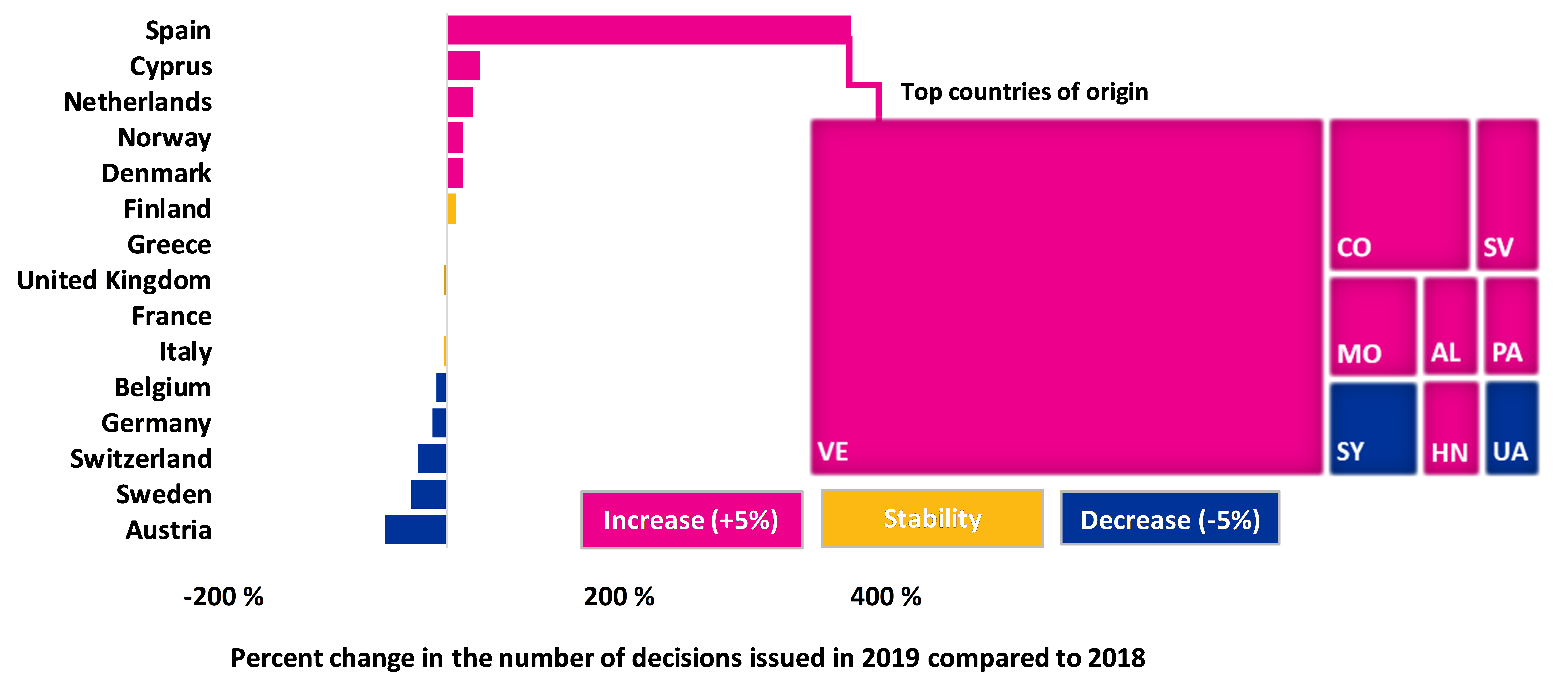 In addition to applicants from Venezuela, other Latin American nationals received more decisions in 2019 than in previous years. There were more than three times as many decisions issued in 2019 compared to 2018 to nationals of Colombia and El Salvador, largely in Spain.