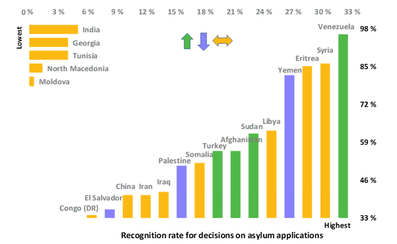 The first instance recognition rate refers to the number of positive outcomes as a percentage of the total number of first instance decisions. More specifically, the total recognition rate is calculated considering refugee status, subsidiary protection and humanitarian protection as positive decisions.