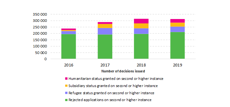 Data are not disaggregated by the type of decision appealed, thus it is not possible to imply in how many cases a positive final decision reversed a negative decision. As a result, analyses of decisions of higher instances are extremely challenging and results should be interpreted with caution.