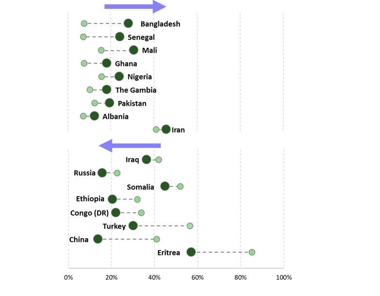 Figure 4.12 Lowest and highest recognition rates on first instance decisions for the main citizenships of applicants in 2019 and changes compared to 2018