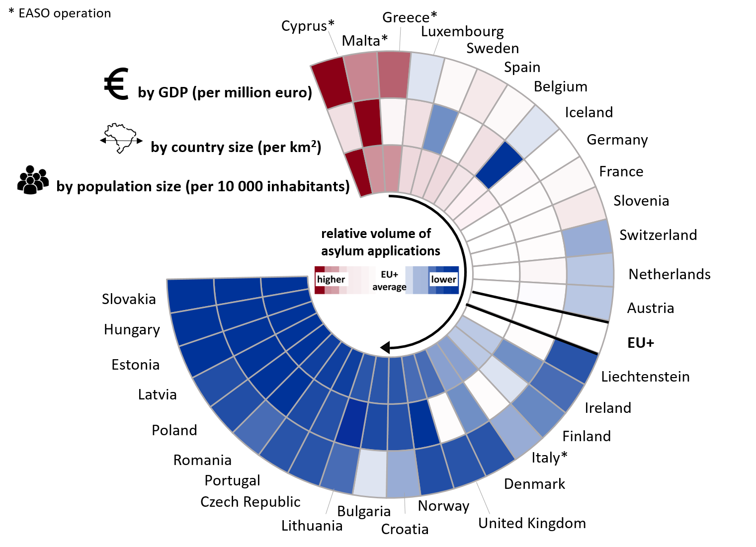 Notes: Countries are sorted by the number of applications relative to population size (from higher to lower volumes, indicated by the arrow). The shades indicate the number of relative applications received compared to the EU+ baseline.