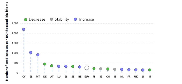 Note: The colours of the caps indicate the degree of change from 2018 (decrease - 10 %; increase > + 10 %). EU+ countries with fewer than 50 pending cases for every 100 000 inhabitants are not displayed.