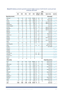Subsidiary protection status at second or higher instance in EU+ countries by reporting country and main citizenship, 2015-2019