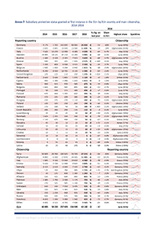 Subsidiary protection status at first instance in EU+ countries by reporting country and main citizenship, 2015-2019