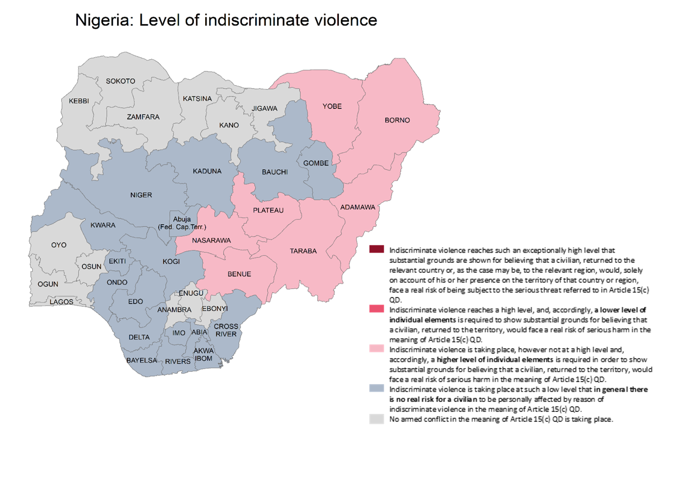 Applying the low threshold introduced with the Diakité judgment, it is found that several armed conflicts in the meaning of Article 15(c) QD take place in Nigeria, in particular on the territory of the following states: Abia, Adamawa, Akwa Ibom, Bauchi, Bayelsa, Benue, Borno, Cross River, Delta, Edo, Ekiti, Gombe, Imo, Kaduna, Kogi, Kwara, Nasarawa, Niger, Ondo, Plateau, Rivers, Taraba, Yobe, as well as the Federal Capital Territory of Abuja.