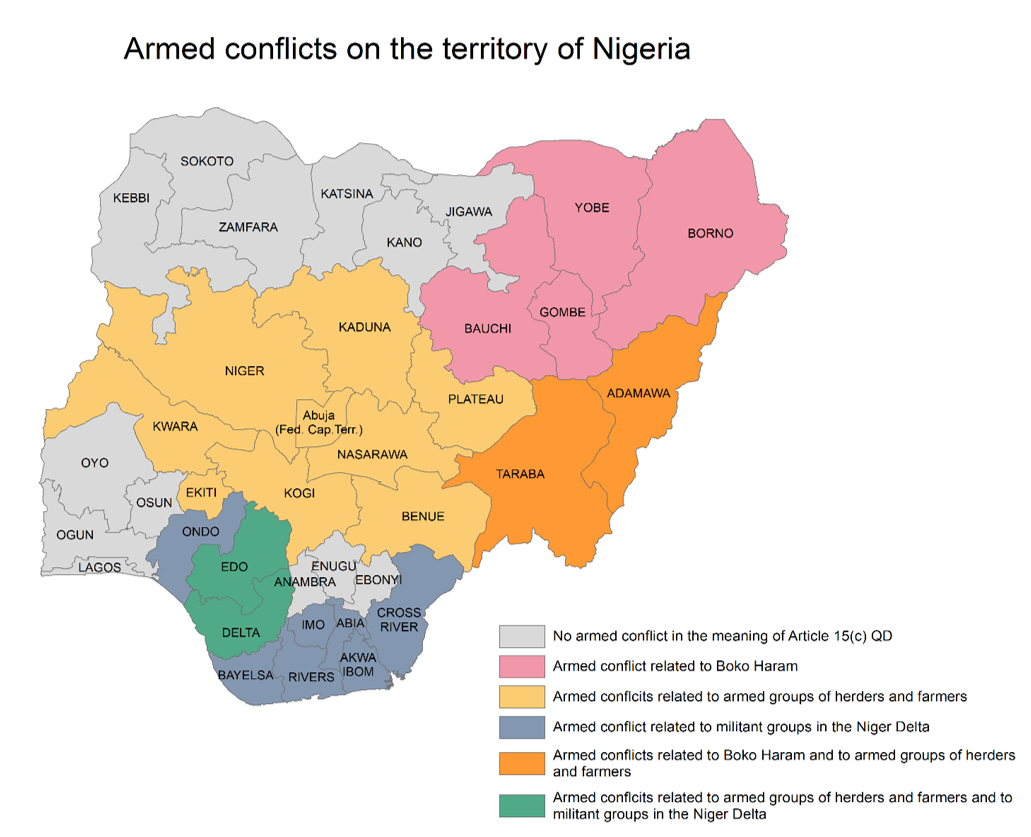 According to COI, and applying the low threshold introduced in the Diakité, it is concluded that the following distinct armed conflicts in the meaning of Article 15(c) QD take place in Nigeria: