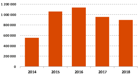 At the end of 2018, some 896 560 applications were awaiting a final decision in the EU+. This was only 6 % less than those at the same time in 2017 but 21 % less than those at the end of 2016 (Figure 23). A decline was registered for the second year in a row. Nevertheless, the number of pending cases at the end of 2018 was considerably higher than at the end of 2014.
