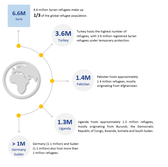 Nationals from Syria accounted for one-third of the global refugee population, with 6.6 million who have fled their country. |
