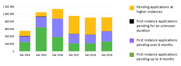 At the end of 2019, close to 912 000 applications for international protection were still awaiting a decision in EU+ countries, representing almost 1 % more than in 2018. Overall, the backlog was still much higher than pre-crisis levels, which illustrates the heightened pressure under which EU asylum systems are currently operating. Germany continued to have by far the most open cases, but in contrast to many other EU+ countries, there was a reduction in the overall number between the end of 2018 and 2019. The stock of pending cases was considerable and growing in Belgium, Greece, France, Spain and the United Kingdom. Calculations based on Eurostat and EASO data highlight that more than one-half of the cases awaiting a decision, or over 540 000, were pending at first instance. In all countries with significant increases in the number of pending cases, the trend was largely driven by the fact that more applications were being lodged, and thus, most of the backlog was accrued at first instance.