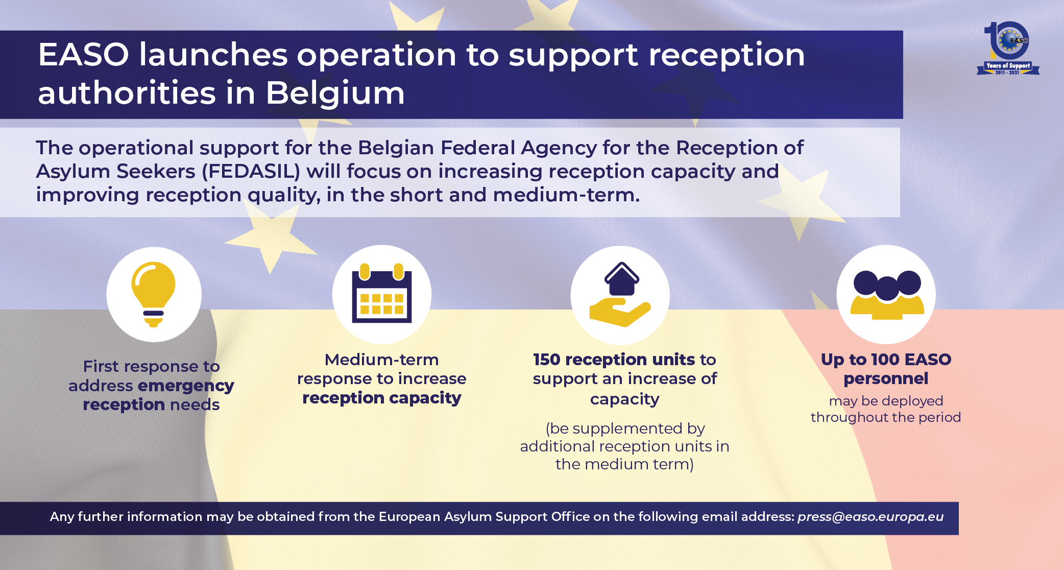 The European Asylum Support Office (EASO) will launch its 8th operation in an EU Member State in January 2022. The operational support for the Belgian Federal Agency for the Reception of Asylum Seekers (FEDASIL) will focus on increasing reception capacity and improving reception quality, in the short and medium-term.