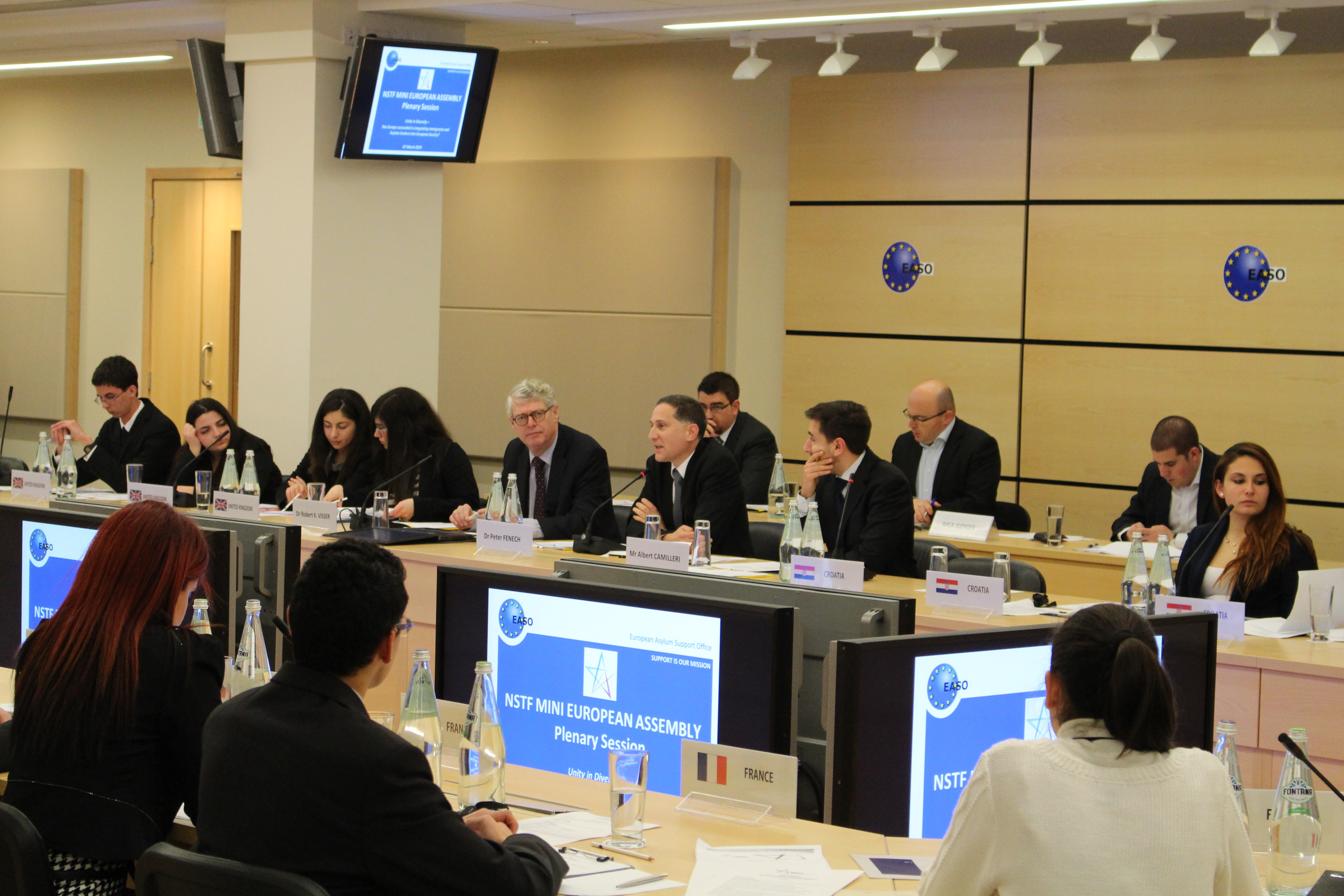 EASO hosted the NSTF mini European Assembly Plenary Session on 7 March 2014. The Mini European Assembly is an educational simulation exercise, open to teams of students from post-secondary and tertiary level institutions, where they discuss various issues related to European Affairs through the political perspective of the European country they represent both at Committee and Plenary Sessions. About 60 students take part during each edition of the Assembly.